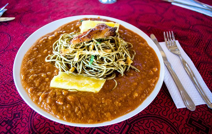 • Sopa Seca con Carapulcra : Duo emblématique composé de nouilles mijotées dans une sauce parfumée et ragoût de pommes de terre séchées au porc et cacahuètes. Un plat riche, familial et profondément identitaire.