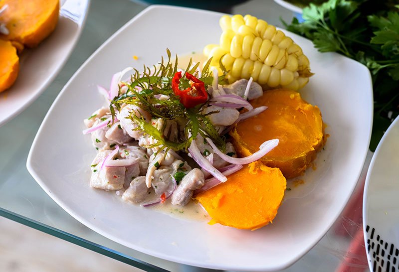 • Ceviche : Poisson cru mariné dans le citron, relevé de piment et coriandre. Symbole absolu du Pérou, il incarne la fraîcheur et la vivacité de la côte pacifique.