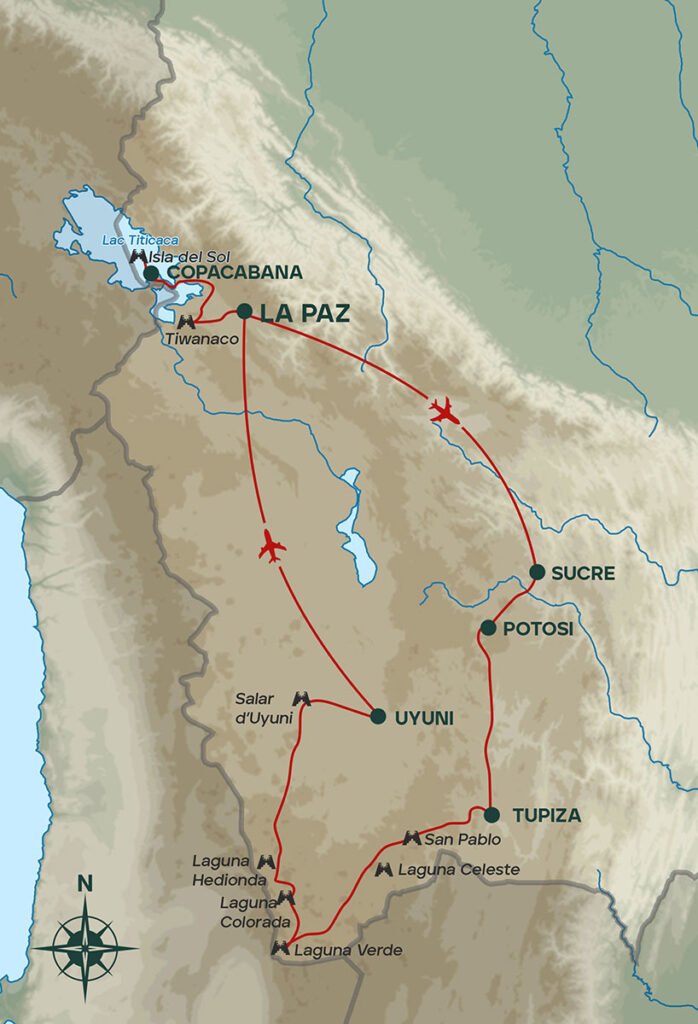 Départ en autonomie complète pour une expédition de 5 jours en 4×4 privé, accompagnés de notre chauffeur et d’une cuisinière. Cet itinéraire nous conduit à travers les paysages exceptionnels du Sud Lipez : lagunes colorées (Colorada, Verde, Hedionda…), geysers, déserts minéraux, formations géologiques étonnantes et villages isolés.