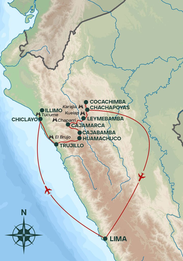 Le matin, transfert à l’aéroport et vol pour Chiclayo. Départ pour la petite ville de Lambayeque, réputée pour ses remarquables musées d’archéologie. La visite commence par le musée du Seigneur de Sipán, consacré à l’une des découvertes majeures de l’archéologie mondiale. Ce lieu exceptionnel présente les fastueux ornements en cuivre doré et en or, ainsi que les dépouilles de deux grands dignitaires mochicas mises au jour dans le mausolée de la Huaca Rajada. Après un déjeuner dans un restaurant local, route vers la Huaca Chotuna, site étroitement lié à la légende de Naylamp, fondateur mythique des Lambayeque. C’est ici qu’a été découverte la sépulture de la prêtresse de Chornancap. La visite inclut le musée et les frises colorées encore étudiées par les archéologues. En fin de journée, passage par la station balnéaire de Pimentel, dont le long ponton, le plus vaste du Pérou, servait autrefois à l’exportation du sucre acheminé par train. Dîner et nuit à Chiclayo (27 m).